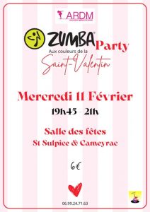 Rendez-vous le mercredi 11 février de 19h45 à 21h00 à la Salle des fêtes de St Sulpice & Cameyrac pour 1h15 de danse, de sport et de bonne humeur dans une ambiance festive et conviviale.
